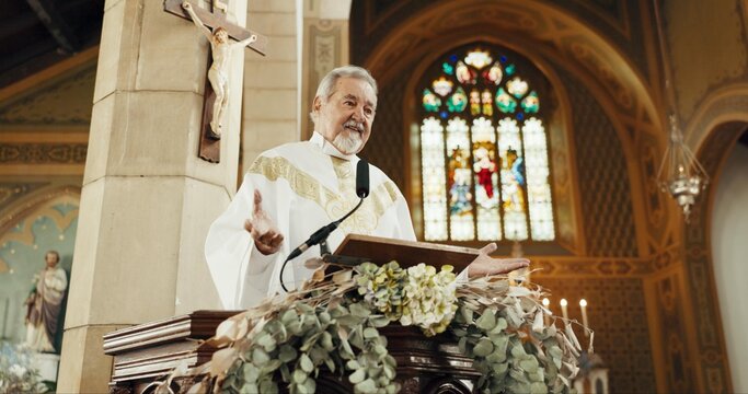 Religion, priest and man preaching in church for sermon, heaven and gospel of God. Senior pastor, spiritual leadership and speech for worship, holy spirit and community prayer service of Jesus Christ