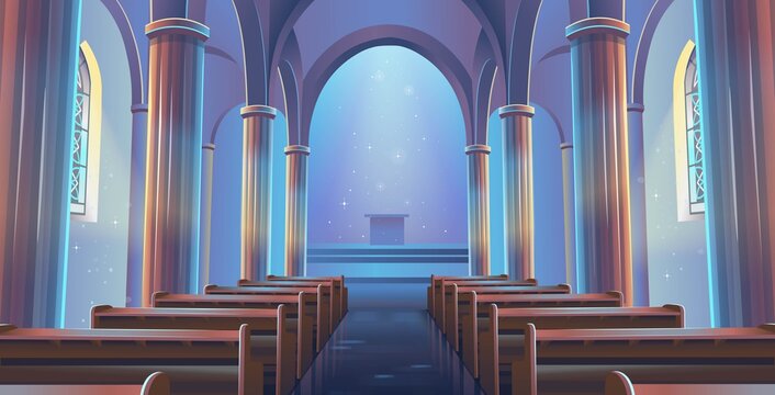 Cathedral Church view inside. Interior of Catholic Church. Cartoon vector illustration