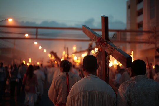 A religious procession carries crosses and torches during a solemn evening ceremony at dusk in the street.