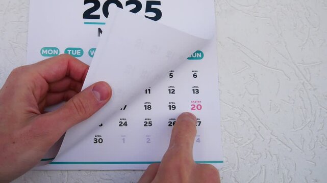 Close-up of the marked Easter date on a wall calendar 2025 page