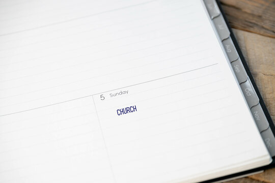 Church written on a calendar as a reminder to attend services on Sunday.  Christian worship concept.