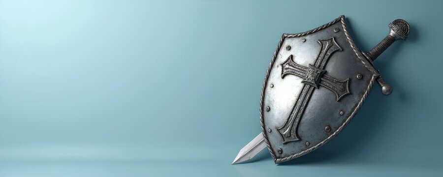 Silver medieval shield sword cross light blue background. Antique weapon, knight armor, historic defense. Medieval battle concepts like courage, protection, and religious symbolism of christian faith.