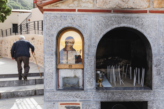 Votive candles near an icon of the Virgin Mary