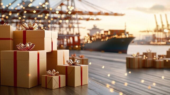Logistic Christmas and New Year concept. A picturesque scene of wrapped gifts at a dockside, with a cargo ship and cranes in the background,  embodying a festive yet industrial atmosphere at sunset.