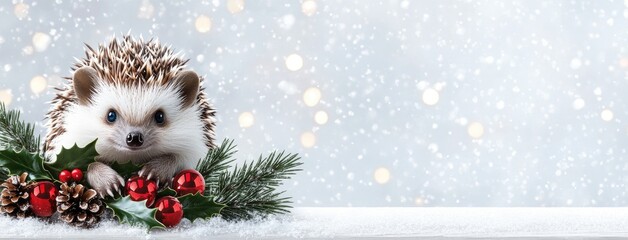 A cheerful hedgehog with bright blue eyes embraces holly amidst the enchanting snowy landscape of My Fantasy World during winter