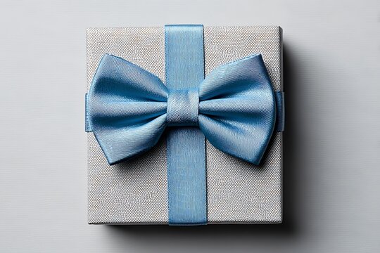 Elegant Gift Box with Blue Bow Tie on Minimalist Background. Perfect for Father's Day, Men's Special Occasions, or Corporate Gifting with Copy Space for Personalization and Celebration Messaging