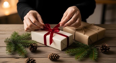 Close-up of hands tying a red ribbon on a white gift box, surrounded by festive pine branches and cones on a wooden table.