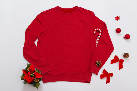 Close up red blank template sweatshirt with copy space and Christmas Holiday concept. Top view mockup hoodie and red holidays decorations on white background. Happy New Year accessories. Xmas outfit