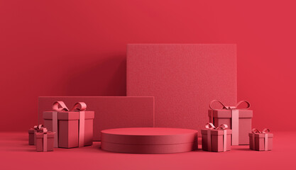 Minimal abstract product background for Valentine and Christmas, Podium with red gift box on red background. 3d render. stage for product design.