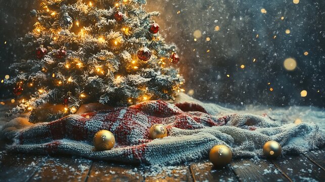 Wooden tabletop in festive setting with blurred lights ideal for product display and holiday celebration themes party backdrop design