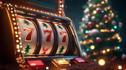 Slot machine reels showing sevens with a festive christmas tree in the background