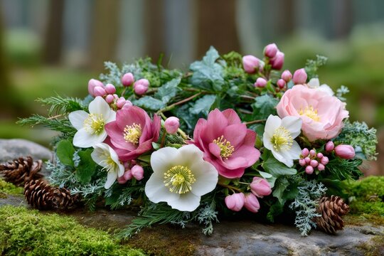 Christmas roses plant used as seasonal decoration, winter floral arrangement, holiday floral display, festive indoor plant setup
