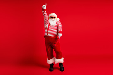 Full length body size view of his he handsome bearded fat overweight cool comic childish Santa listening hit dancing having fun fooling isolated bright vivid shine vibrant red color background