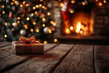 A beautifully wrapped gift sitting on a rustic wooden table in front of a glowing fireplace and a Christmas tree adorned with shimmering lights