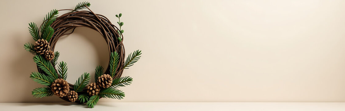minimalist winter scene featuring rustic christmas wreath crafted twisted evergreen branches pinecones delicate foliage set