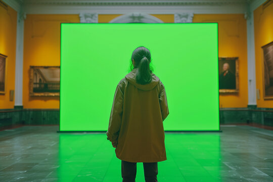 A woman stands in a museum and looks at a green screen, chroma key. Back view. Exhibition center, cinema. Banner, advertising, announcement, mock up