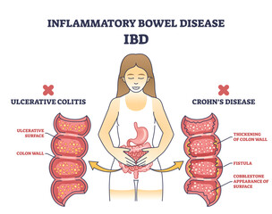 Inflammatory bowel disease or IBD with Crohns condition and ulcerative colitis outline diagram. Labeled educational scheme with chronic inflammation of gastrointestinal tract vector illustration.