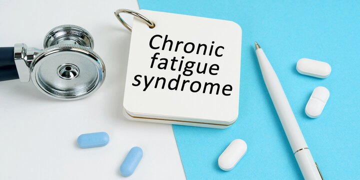 On a white and blue surface are pills, a stethoscope, a pen and a notepad with the inscription Chronic fatigue syndrome