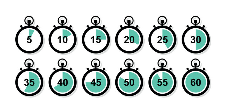 Stopwatch timer icon set with 5-minute intervals. Vector clock illustration for countdowns, cooking, sports, and UI design from 5 to 60 minutes