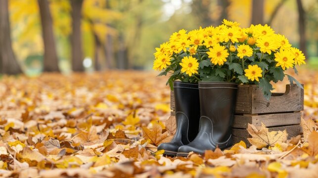 Autumn garden tools and vibrant chrysanthemums in a tranquil forest with rain boots