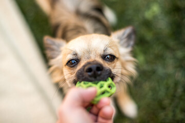Chihuahua plays with a ball on the lawn