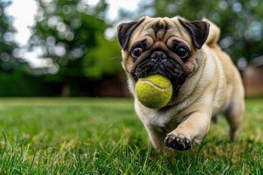 Dog Playing Catch. Cute Puppy Playing with Tennis Ball in the Park