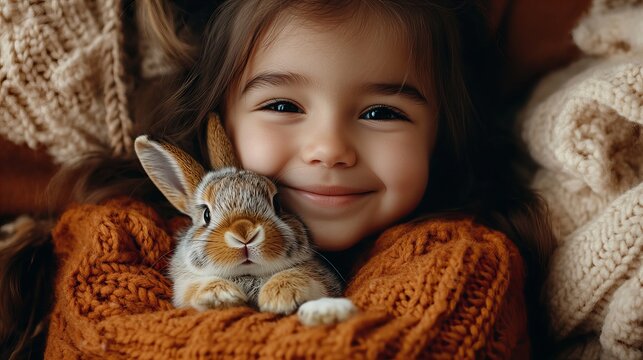 Smiling young girl is holding a small brown and white rabbit in her arms while wrapped in a chunky knit orange sweater and surrounded by a textured cr