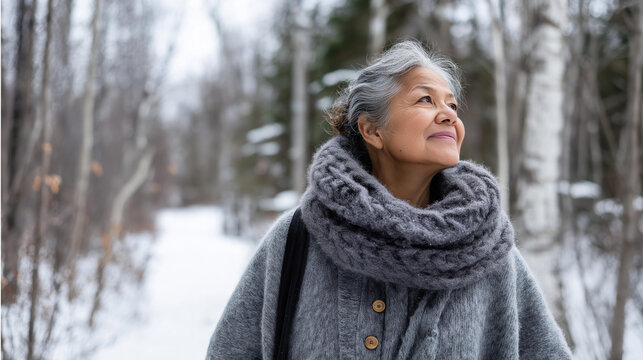 Embracing winter weather: woman wrapped in gray cozy attire