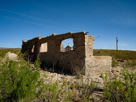 A church steeple seen through the remains of a building in the ghost town of  Lake Valley, New Mexico