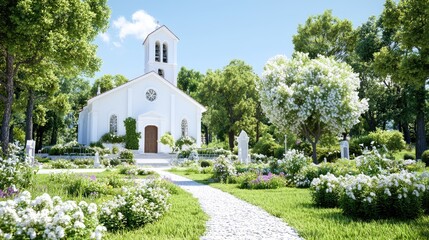Wedding church interior with white flowers. 3D rendering.