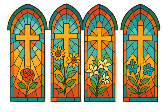 Stained glass church window set with Christian cross and flowers. Religious symbol with rose, sunflower, lily. Gothic cartoon vector illustration on transparent background.