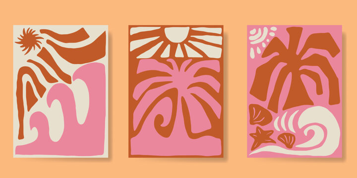 A tropical beach and surf-themed vector set with palm trees, waves, surfboards, a van, flamingos, and ocean elements with quotes, in a bold graphic style. Perfect for t-shirt prints, posters, stickers