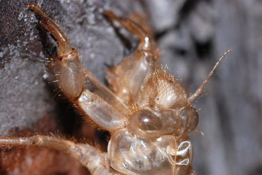 vista macro del guscio secco e vuoto di una cicala, attaccato alla corteccia di un albero, in estate