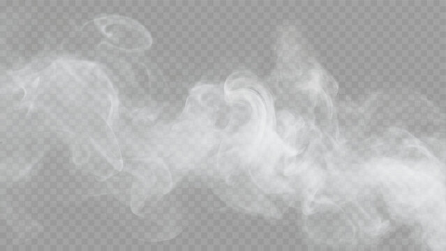 Smoke vector collection, isolated, transparent background. Set of realistic white smoke steam, waves from coffee,tea,cigarettes, hot food,... Fog and mist effect.