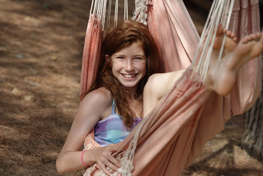 Portrait of smiling girl lying in a hammock