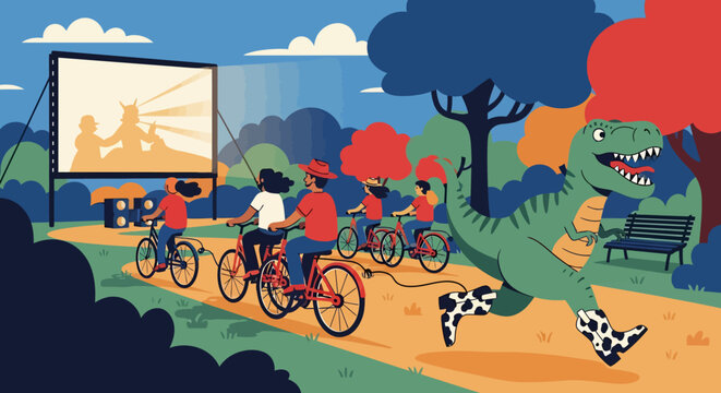 Cyclists and a Dinosaur Enjoying an Outdoor Cinema Experience Together