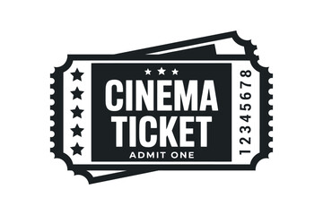 Vector illustration of a cinema ticket with the words Cinema Ticket and admit one, featuring a number series and stars design in black and white. Ideal for entertainment, movie passes, and event