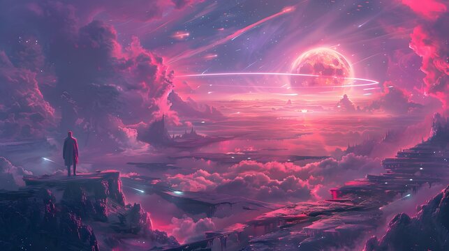 Surreal Fantasy Landscape with Glowing Moon and Silhouetted Cliffs