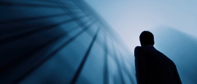 Silhouette of business person looking up at skyscraper, concept of ambition and growth, cinematic composition,