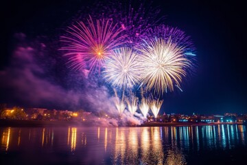 Colorful Fireworks Display Over Calm Water at Night Time Celebration