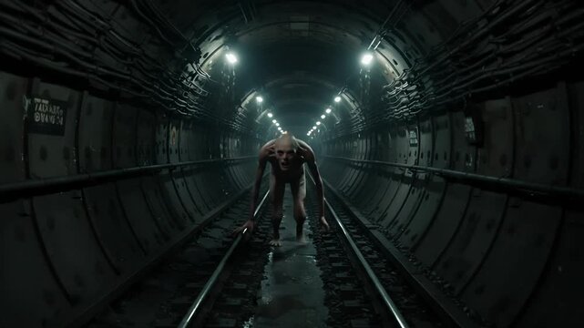 Pale humanoid creature moves menacingly along dark, wet subway tracks in a dimly lit, grimy tunnel, its unsettling form barely illuminated, evoking intense horror and survival scenarios