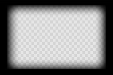 Transparent black vignette border frame overlay shadow effect for video or image mockup. Blank vignette blurred decorative frame with realistic shadow on transparent background. Vector illustration.