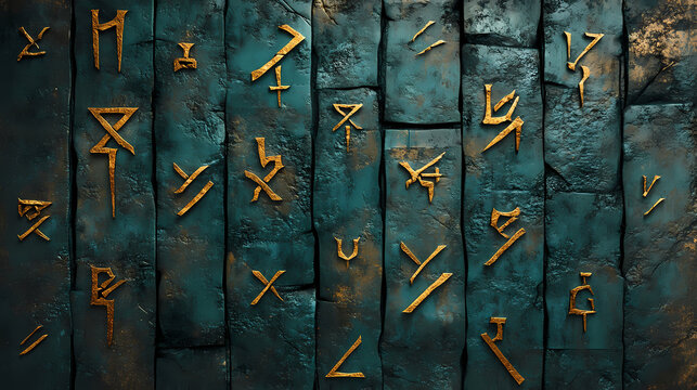 Ancient teal stone wall with golden runic symbols, weathered texture and mysterious inscriptions concept of fantasy, history, and medieval background. Runic Cipher. Illustration