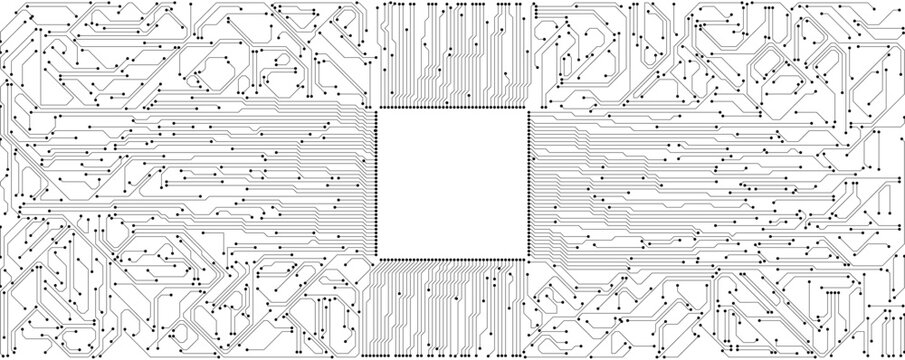 Circuit board with an AI brain icon in the center. A blue and black color theme