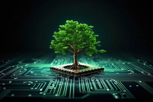 Green tree grows from circuit board. Eco tech concept. Sustainable future. Environmentally friendly innovation. Renewable energy, responsible tech. Future green, digital. Conceptual image for green