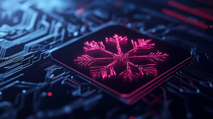 Circuit board with glowing snowflake pattern illustrating winter technology theme