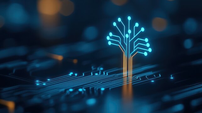 Digital tree with circuit lines on a motherboard, glowing against a dark background.