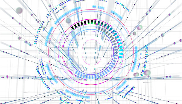 Abstract digital background with futuristic circular interface, binary code, and data visualization on a white backdrop. Concept of technology. 3D Rendering.