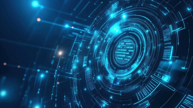 Digital shield glowing blue with futuristic circular interface showcasing advanced cybersecurity protection technology and security defense system in high tech digital environment