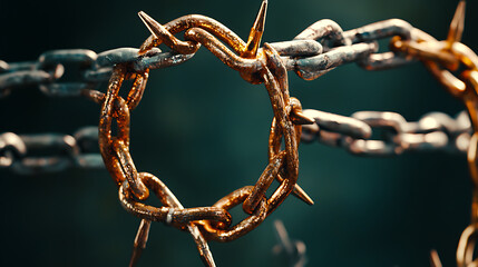 close up of rusty chain with sharp spikes, symbolizing danger and restriction. intricate details highlight texture and color variations